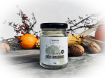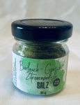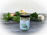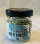 Natursteinsalz mit Tagetes, Gundelrebe, Petersilie, Melde, Maggikraut, Wiesenlaabkraut, Karottengrün, Selleriegrün, Oregano, Schnittlauch, Schafgarbe, Zwiebel, Franzosenkraut, Lauchgrün, Knoblauch, Vogelmiere und Basilikum