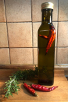 Unser Olivenöl, verfeinert mit Chilis aus unserem naturbelassenen Garten
